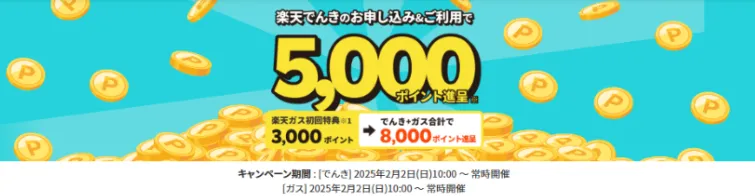 2025年2月時点、楽天エナジーに申し込むと5,000円分の楽天ポイントが受け取れます。