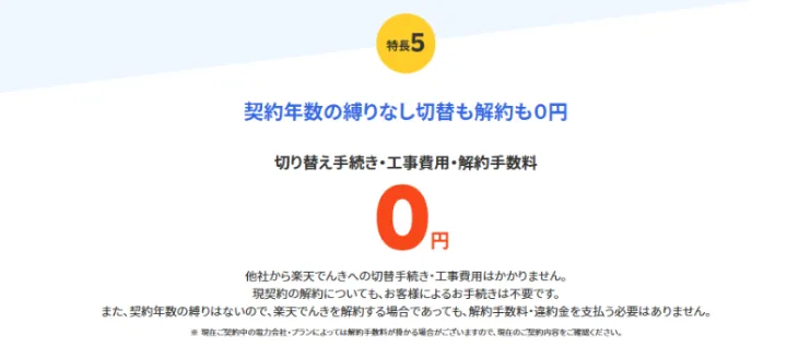 楽天エナジーは解約金0円で契約の縛りがない電力サービスです。そのため、万が一楽天エナジーに切り替えて納得できなった場合は、解約金なしでほかの電力会社に切り替えることができます。