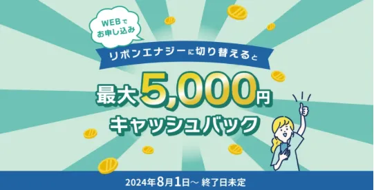 リボンエナジーは2024年8月からWebからの申し込みで、最大5,000円分のキャッシュバックキャンペーンをおこなっています。そのため、電力会社をお得に乗り換えたい方はリボンエナジーは、おすすめできる電力会社です。
