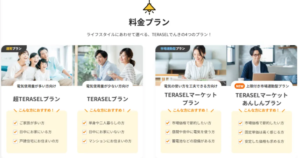 TERASELでんきが提供しているプランは4つあり、家族の人数や生活スタイルによって自分に合ったプランを選べます。
