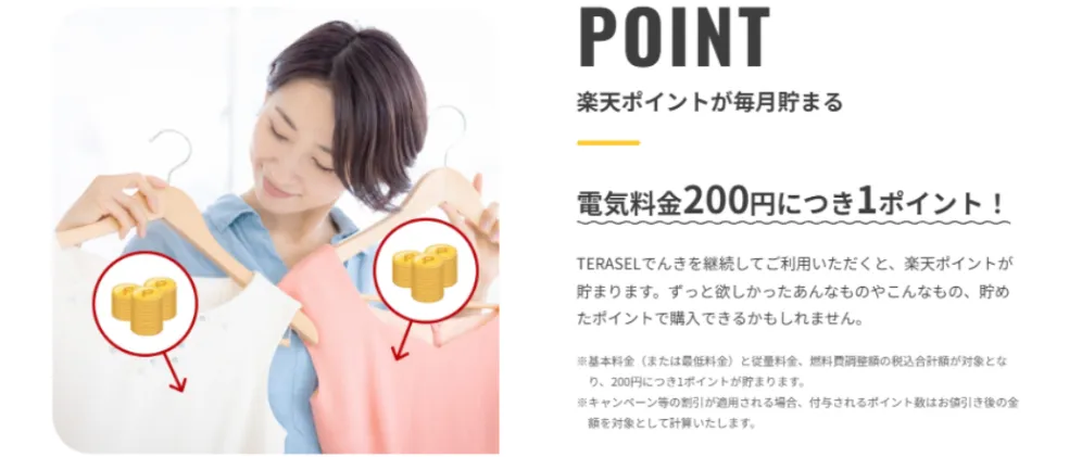 毎月の電気料金に応じて楽天ポイントが貯まることがTERASELでんきの一つの強みです。