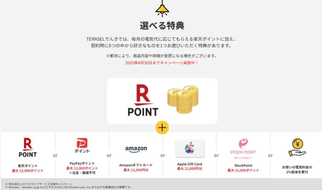 TERASELでんきの選べる特典は、以下のとおりです。