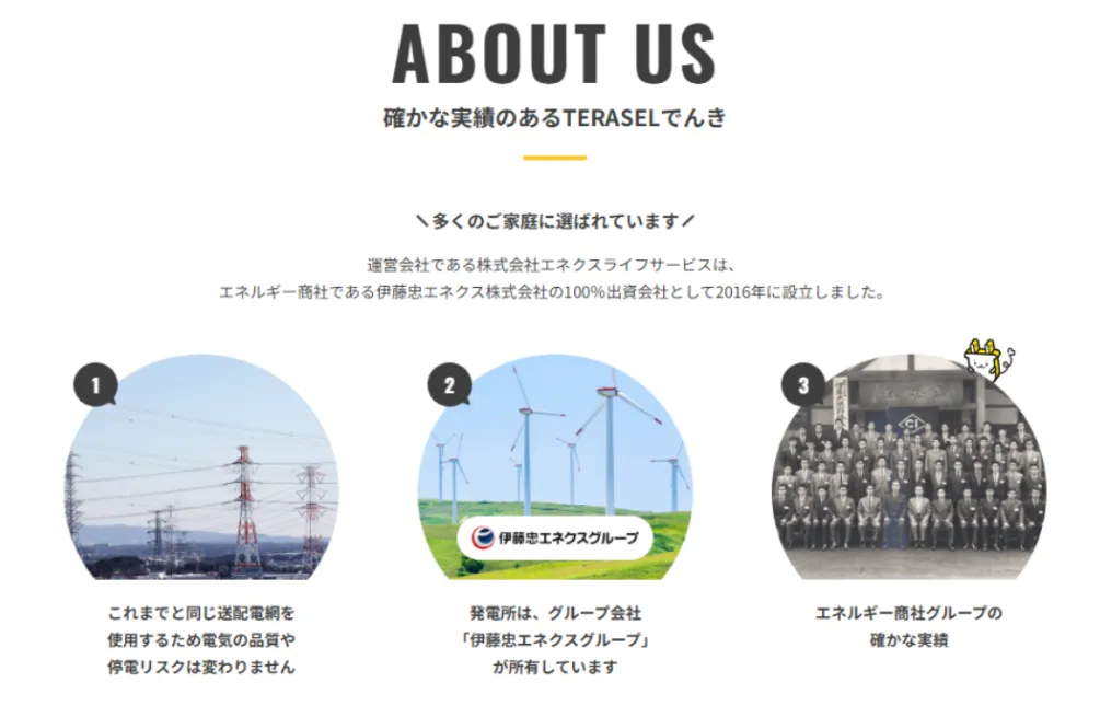TERASELでんきは、伊藤忠エネルギーグループの電力サービスとして60年以上の歴史を誇っています。そのため、これまで長年にわたって多くの法人や個人に利用されてきた電力サービスだといえます。
